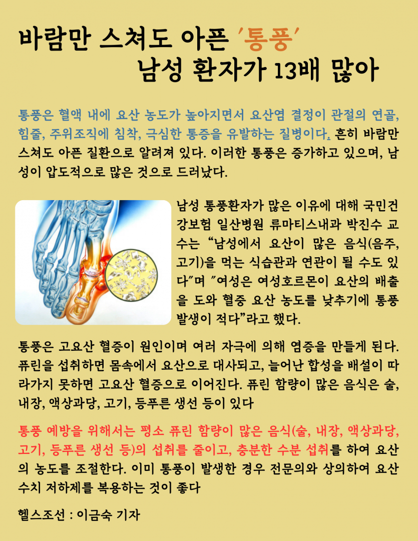바람만 스쳐도 아픈 '통풍' 남성 환자가 13배 많아 페이지 정보 작성자 닥터루카 댓글 0건 조회 527회 작성일 23-12-26 11:56 본문 . 목록 이전글물을 많이 마셔야 하는 질환 vs 물을 적게 마셔야 하는 질환 23.12.26 다음글넥스트BT자회사 기능성 원료 멜로시라 항비만 및 항산화 효과 - 서울경제TV 23.12.13 댓글목록 댓글목록 등록된 댓글이 없습니다.